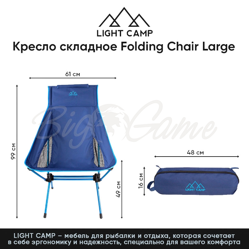 Кресло складное LIGHT CAMP Folding Chair Large цвет синий – данный товар доступен для заказа в интернет-магазине BigGame по цене 6 990 руб. с доставкой в Челябинске и по всей России. Для того, чтобы купить данный товар, положите его в корзину или позвоните по телефону +7 (351) 220-15-00