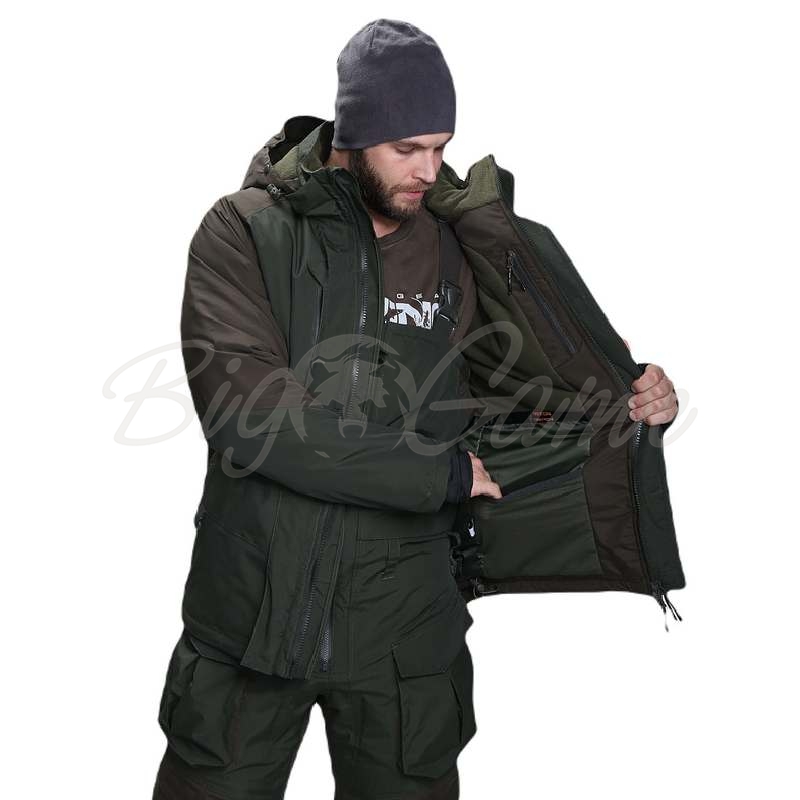 Куртка Pro Angler -15 имеет высокий воротник и несъемный капюшон с гибким козырьком, который можно регулировать по объему за счет крепкой резинки. Для лучшей защиты от ветра, молния куртки прикрыта ветрозащитным клапаном на бесшумных магнитах. Для удобства застегивания на молнии имеется два бегунка, которые позволят застегивать куртку как сверху, так и снизу. Низ куртки регулируется утяжкой-шнуром для лучшей фиксации куртки на бедрах. Рукава не будут мешать вашим движениям и не дадут замерзнуть рукам за счет эластичный манжеты на кисти. На куртке имеется семь карманов. Четыре вместительных кармана располагаются на внешней части курки, два из которых закрываются на молнию для более надежного хранения необходимых вещей. Также у куртки есть три внутренних кармана для хранения самых важных вещей, таких как мобильный телефон, ключи и документы. По бокам куртки располагаются пластмассовые полукольца для подвеса различных приспособлений, к которым нужен быстрый доступ.