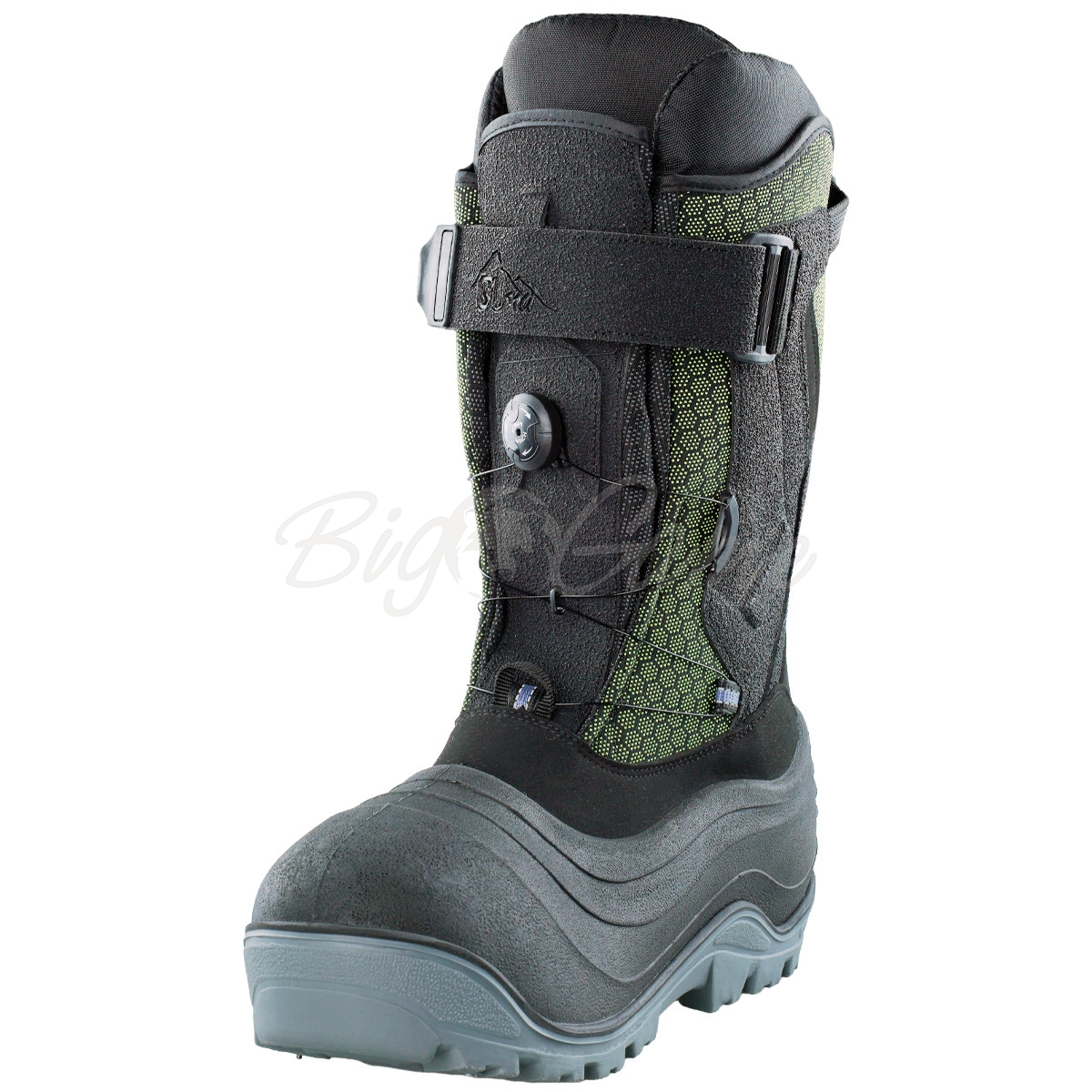 Сапоги предназначены для самых холодных условий. Двойная конструкция, внутренний и внешний сапог. Внешний сапог водонепроницаемый и двусоставный, снизу голошка из термостойкого вспененного полиуретана, сверху водонепроницаемый и прочный текстиль оксфорд с обширными полимерными накладками. Сзади основательная петля и светоотражающая вставка. За фиксацию на ноге отвечают в верхней части липучка, а в нижней быстрая шнуровка. Подошва выполнена и морозоустойчивого полиуретана и 12 шипов с наконечниками, которые обеспечат превосходное сцепление на льду. Шипы съемные. Внутри толстая, многослойная фальгировнная стелька для теплоизоляции и дополнительной амортизации. Внутренний сапог состоит из нескольких слоев: флис, полиэфирное волокно и фольга.
