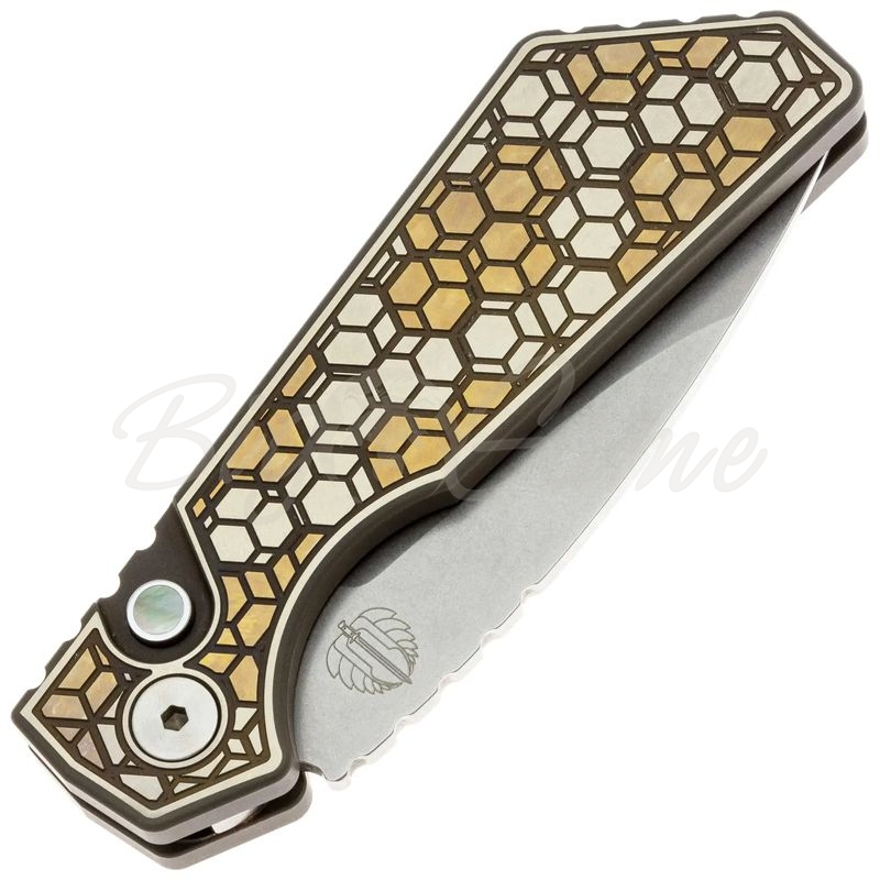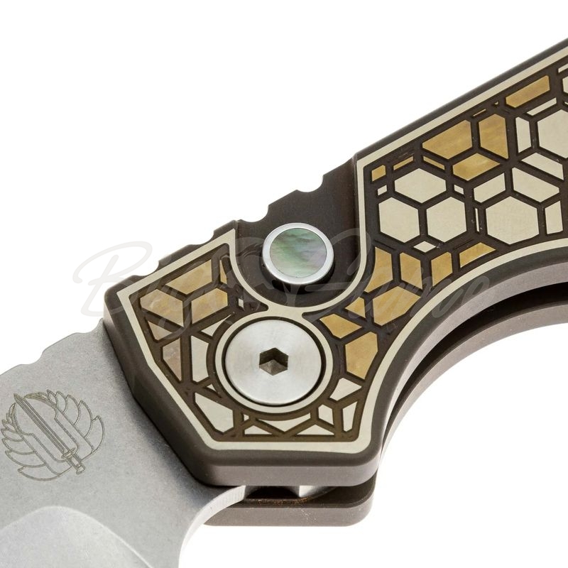 Рукоять выполнена из титана — легкого, прочного и коррозионно-стойкого материала, который обеспечивает оптимальный баланс между весом и прочностью. Уникальная текстура Gridlock в бронзовым анодирование создается с помощью высокоточной CNC-обработки и является фирменной особенностью серии Custom, придавая каждому ножу индивидуальный характер. Эргономичная форма рукояти с насечкой на обухе гарантирует надежный хват и комфорт при длительном использовании. Все грани рукояти аккуратно обработаны, что делает нож приятным в руке даже при продолжительной работе. Для удобства ношения нож оснащен клипсой глубокого ношения tip-up, обеспечивающей скрытое ношение в правом кармане.