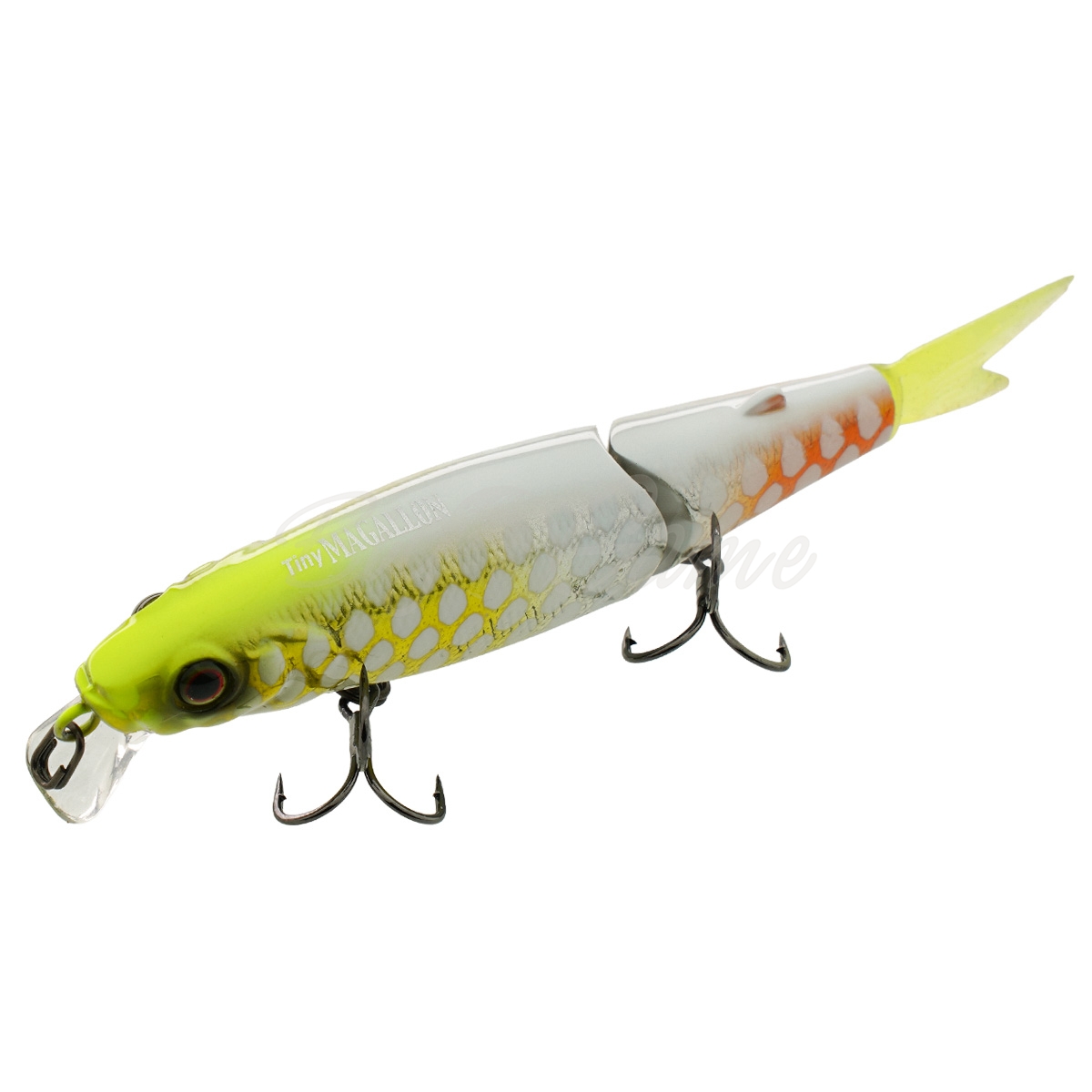 Tiny Magallon – двухсоставной воблер с оригинальным дизайном. В хвостовой части располагается мягкий, но стойкий к щучим зубам, хвостик, который при проводке дополнительно соблазняет рыбу. Даже при малой амплитуде рывков спиннинга совершает размашистые развороты и кульбиты в воде, соблазняя даже не активного хищника. Одна из самых добычливых приманок по щуке!