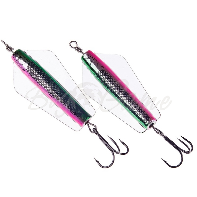 Специальная приманка для ловли лосося и форели, в особенности симы и горбуши. Для анимации рекомендуется использовать троллинговые проводки. Полый канал внутри тела приманки предназначен для пропускания через нее шнура, по которому блесна и будет "гулять" во время проводки. Выпускается уже со смонтированным жестким коротким поводком из проволоки с тройником. Стоит отметить, что наиболее популярный вариант оснастки для таких блесен - смонтировать гибкий поводок общей длиной в районе 10-11 см по которому приманка сможем свободно перемещаться при проводке.