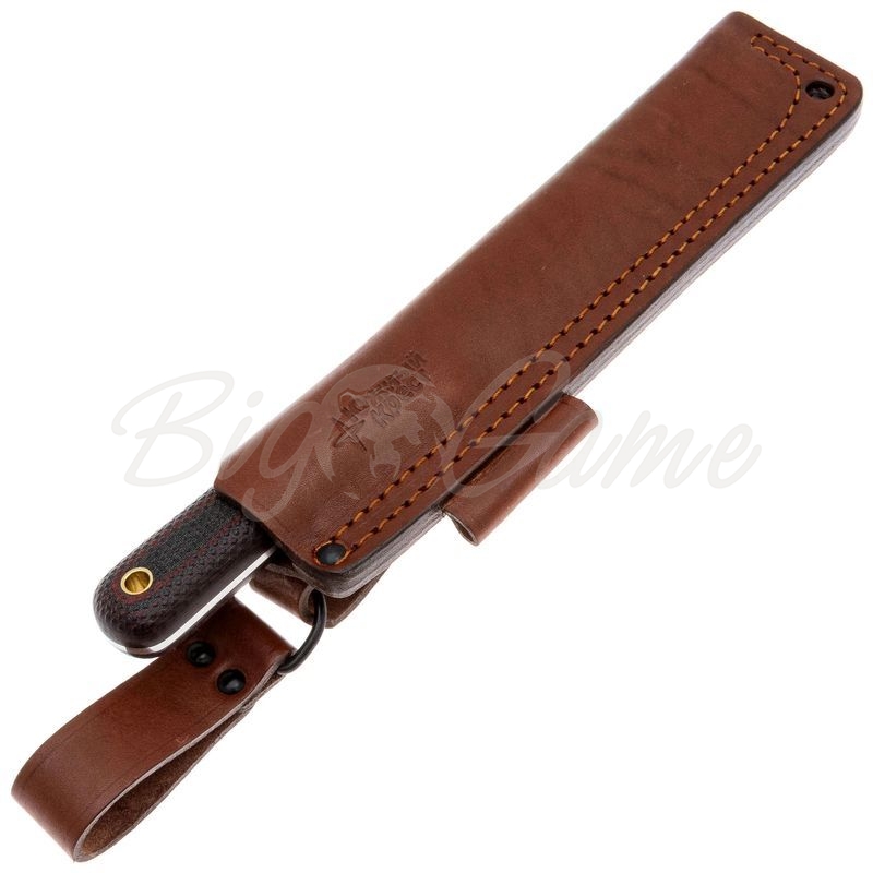 Рукоять, выполненная из микарты, предоставляет отличное сцепление и комфорт при длительном использовании. Этот материал позволяет уверенно удерживать нож как голой рукой, так и в перчатке, что особенно важно в экстремальных условиях. Кефарт оснащён темлячным отверстием, что добавляет функциональности и удобства в использовании. Также важно отметить, что в комплекте с ножом идут качественные ножны из натуральной кожи.