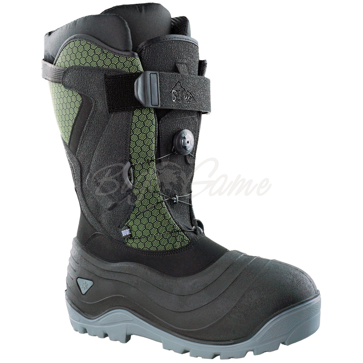 Сапоги предназначены для самых холодных условий. Двойная конструкция, внутренний и внешний сапог. Внешний сапог водонепроницаемый и двусоставный, снизу голошка из термостойкого вспененного полиуретана, сверху водонепроницаемый и прочный текстиль оксфорд с обширными полимерными накладками. Сзади основательная петля и светоотражающая вставка. За фиксацию на ноге отвечают в верхней части липучка, а в нижней быстрая шнуровка. Подошва выполнена и морозоустойчивого полиуретана и 12 шипов с наконечниками, которые обеспечат превосходное сцепление на льду. Шипы съемные. Внутри толстая, многослойная фальгировнная стелька для теплоизоляции и дополнительной амортизации. Внутренний сапог состоит из нескольких слоев: флис, полиэфирное волокно и фольга.
