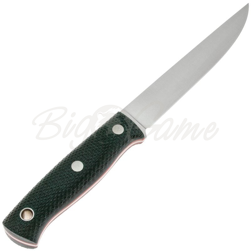 Нож имеет цельнометаллическую конструкцию (full-tang), что делает его невероятно прочным и устойчивым к нагрузкам. Накладки рукояти выполнены из микарты — современного композитного материала, обладающего высокой прочностью и лёгкостью. Благодаря рельефным насечкам рукоять обеспечивает уверенный хват даже в мокрых руках. Такая конструкция гарантирует комфорт при длительном использовании и исключает вероятность выскальзывания ножа. На рукояти предусмотрено отверстие для темляка.