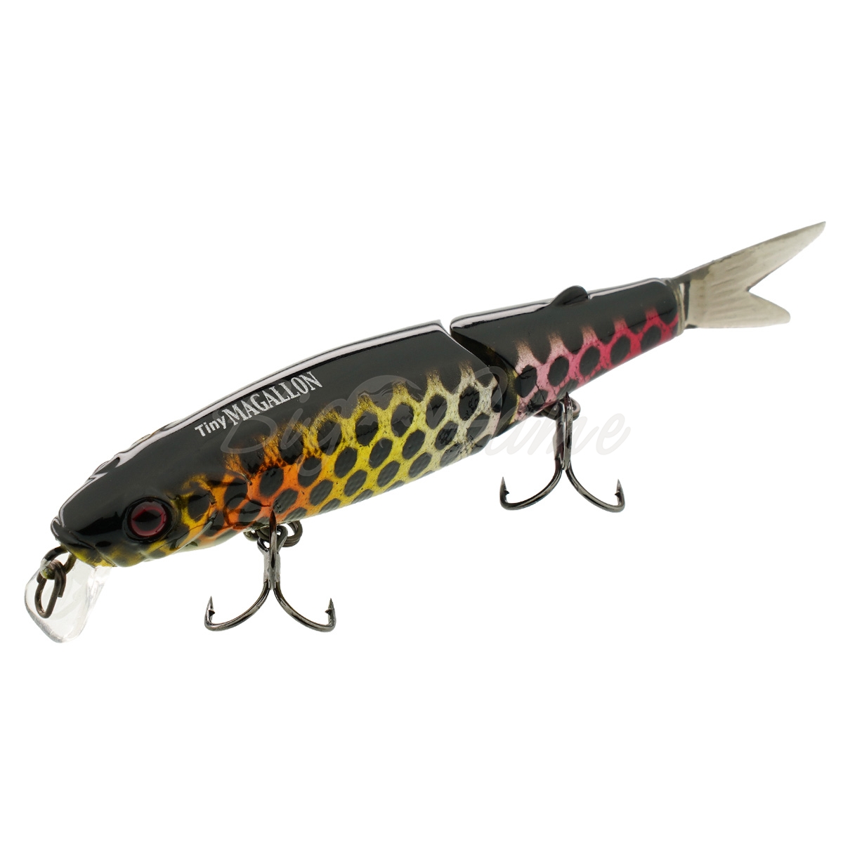 Tiny Magallon – двухсоставной воблер с оригинальным дизайном. В хвостовой части располагается мягкий, но стойкий к щучим зубам, хвостик, который при проводке дополнительно соблазняет рыбу. Даже при малой амплитуде рывков спиннинга совершает размашистые развороты и кульбиты в воде, соблазняя даже не активного хищника. Одна из самых добычливых приманок по щуке!